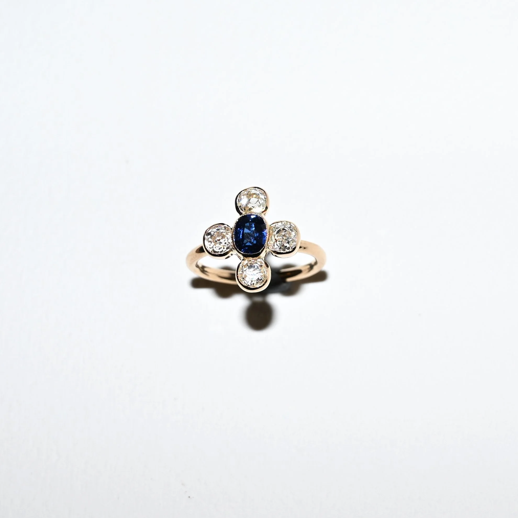 Image 1 of 1 Quatrefoil Ring with Antique Old-Mine-Cut Diamonds and Blue Sapphire $5,250.00 Quantity: Add To Cart Added!