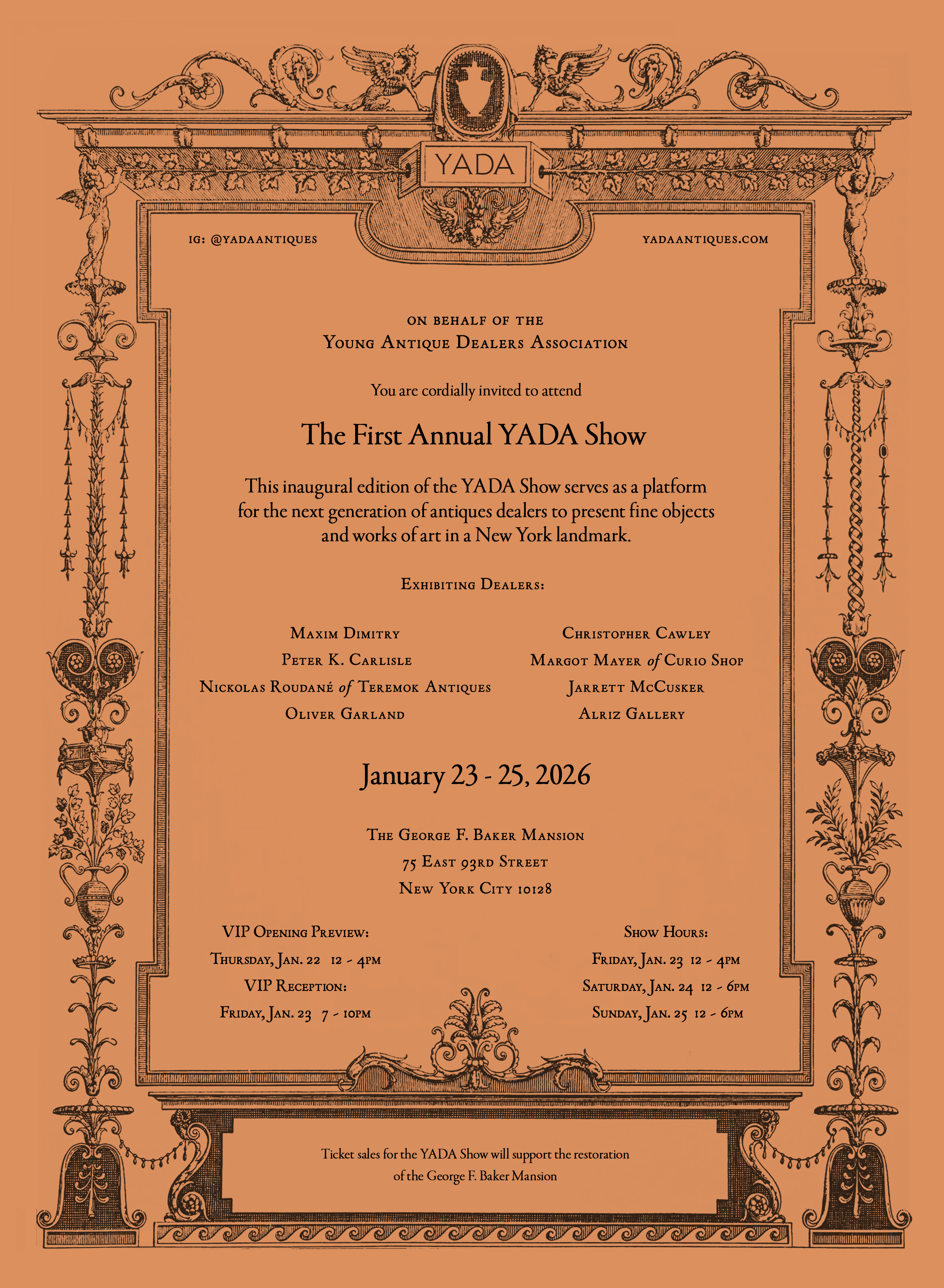 I am pleased to invite you to the inaugural show of the Young Antique Dealers Association taking place at the George F. Baker Mansion from January 22nd-25th. I hope to see you at the opening reception - be sure to secure your tickets soon as they are selling fast!